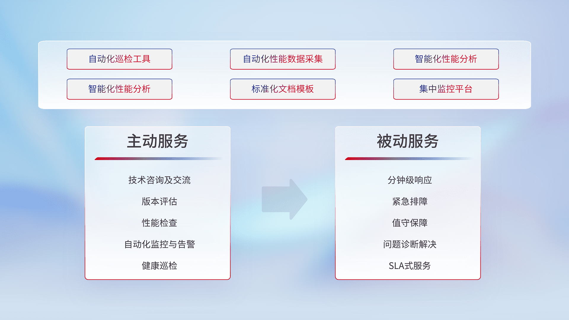 智能化工具和标准化文档,,,保障服务质量,,提供主动服务(包含技术咨询、、版本评估、、、、性能检查、、自动化监控与告警、、、、健康巡检)和被动服务包含(分钟级响应、、紧急排障、、、值守保障、、、、问题诊断解决、、、、SLA服务)。。。。