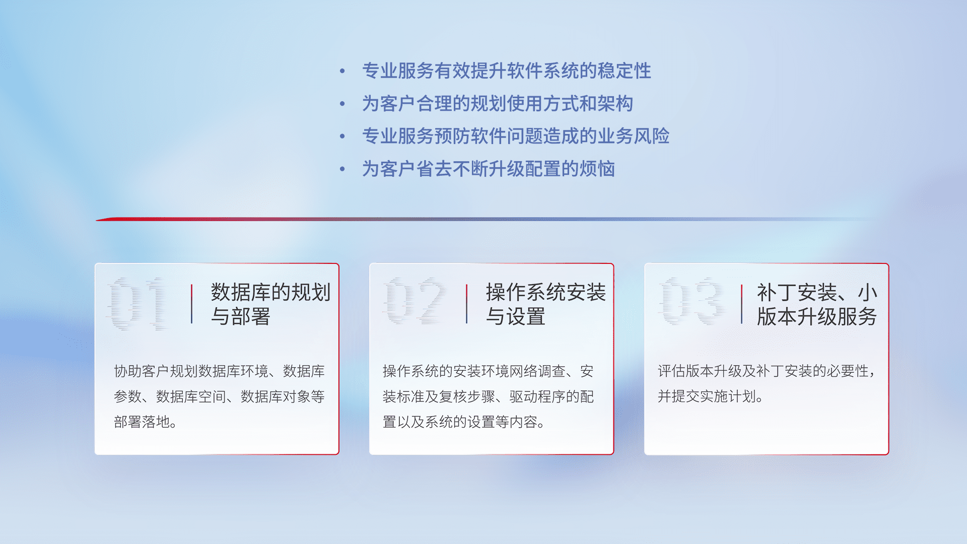 为客户提供软件规模升级、、快速部署、、、按需配置的专业服务,,从数据库的规划与部署到操作系统的安装与设置,,再到补丁安装和小版本升级提供支持。。。
